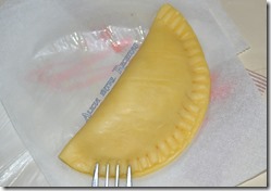 Pinchamos co garfo na parte de arriba (para que saia o vapor en non rebenten ó cociñarse) e imos colocando nunha bandexa forrada con papel de forno. Batemos un ovo e pintamos as empanadillas por riba e xa podemos levalas ó forno.